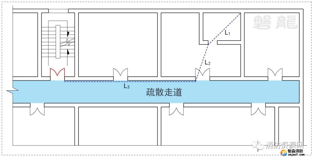 3、確因功能需要,嵌套(穿套)設置的房間不應超過一級,疏散距離應按人員行走的直線距離計算,在圖示4的公共建筑中,示例房間內任一點至房間直通疏散走道的疏散門的直線距離,應為L1+L2。
