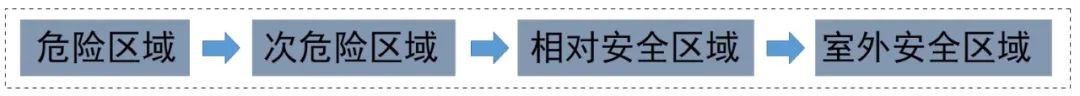 三、人員疏散過程中,從危險區域(房間等)應進入次危險區域(疏散走道等)或相對安全區域、安全區域,不應通過其他危險區域疏散,示例: