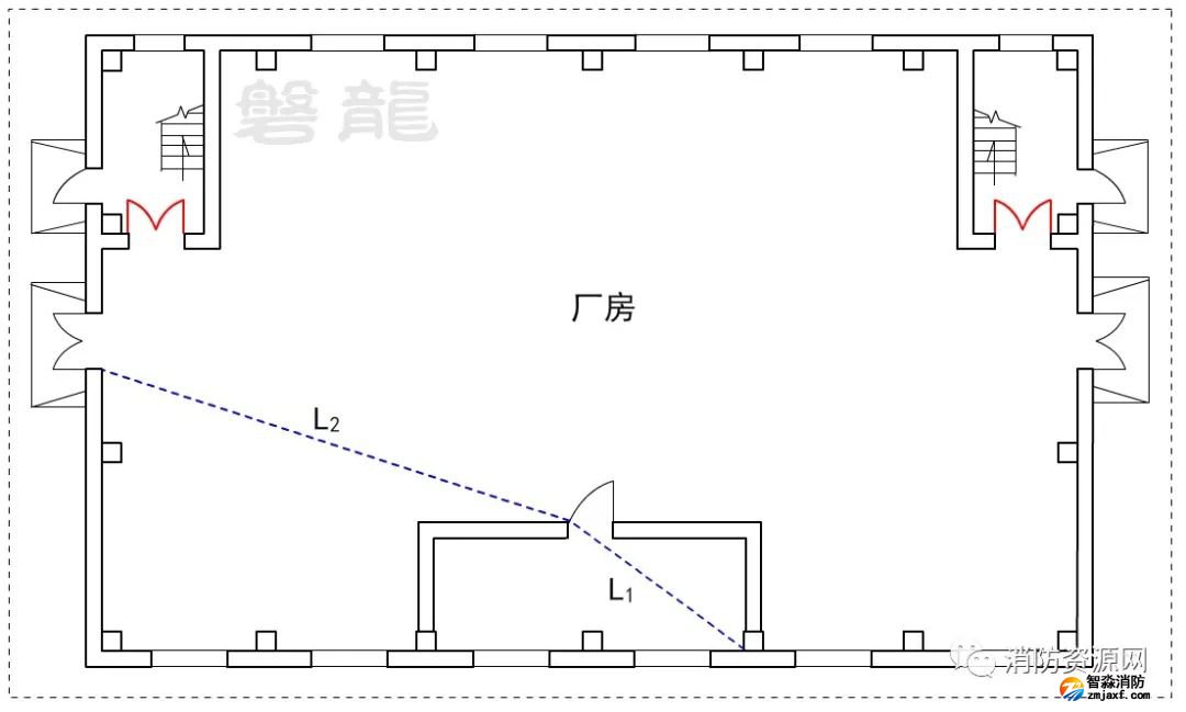 2、廠房倉庫同樣不應采用嵌套(穿套)設置的方式,確因功能需要,嵌套(穿套)設置的房間不應超過一級,疏散距離應按人員行走的直線距離計算,在圖示7的廠房中,示例房間內任一點至安全出口的直線距離,應為L1+L2。