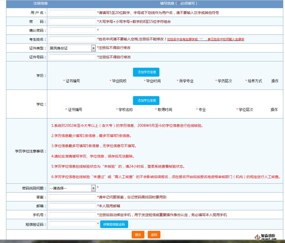 報考人員在填報信息時,姓名、身份證號、學歷及學位信息自動調用用戶注冊信息,填報的信息項中帶“*”的為必錄項,填寫完成后,輸入驗證碼,點擊“保存”按鈕。