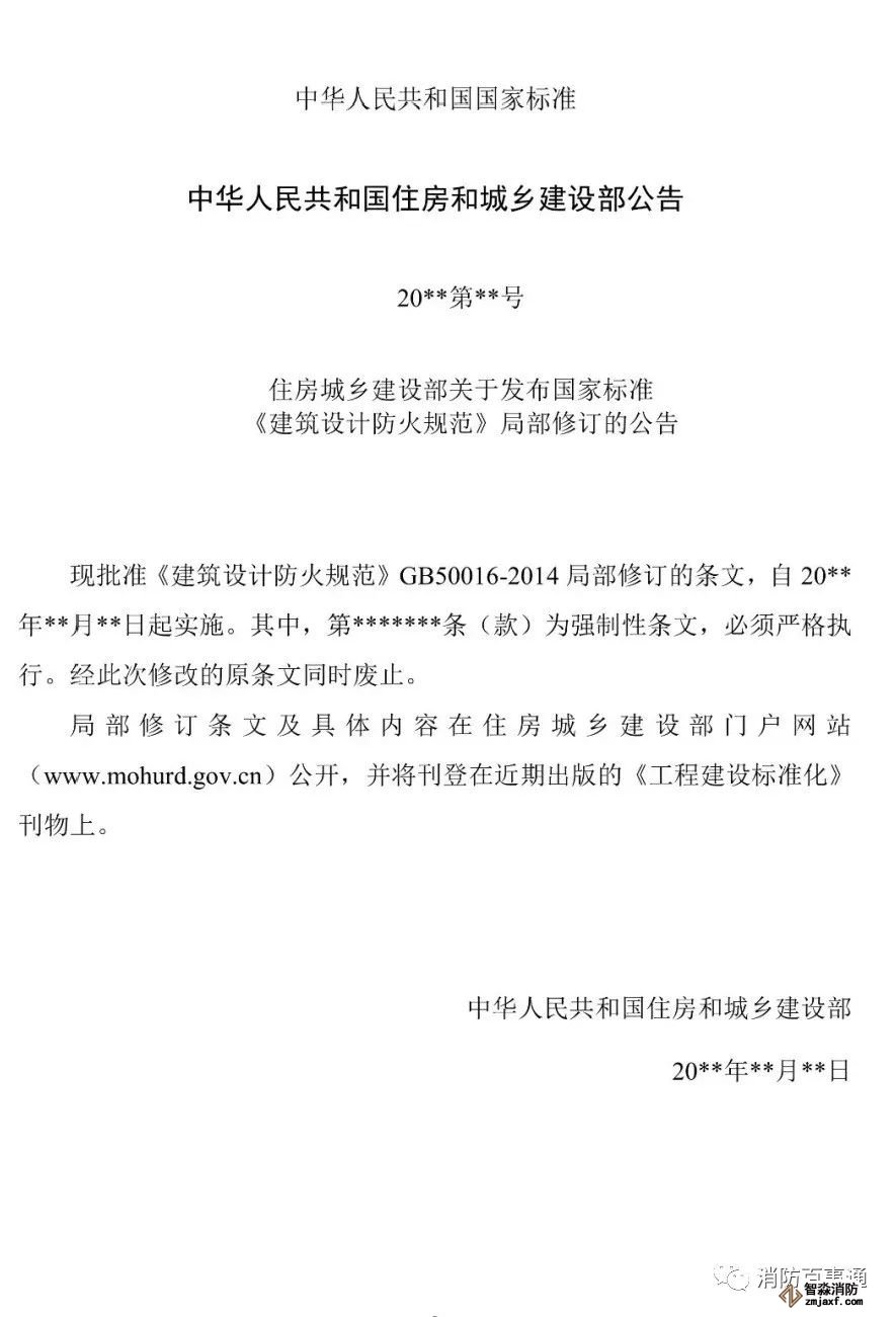 現(xiàn)批準(zhǔn)《建筑設(shè)計(jì)防火規(guī)范》GB 50016-2014局部修訂的條文,自20**年**月**日起實(shí)施。其中,第*******條(款)為強(qiáng)制性條文,必須嚴(yán)格執(zhí)行。經(jīng)此次修改的條文同時(shí)廢止。
