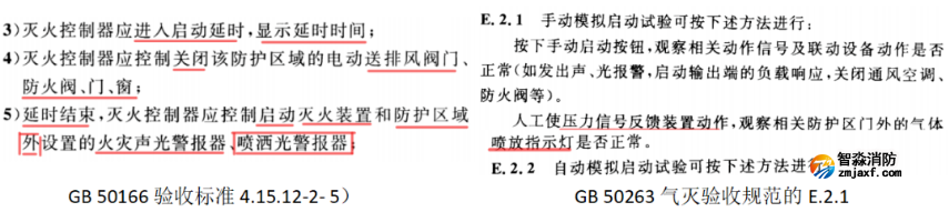 GB 50166驗收標準中規定很明確:啟動延時(通常設置30秒)結束后,在滅火裝置啟動的同時點亮“放氣指示燈”。按理說不應產生爭議,但看一下GB 50263的E.2.1,確實提及:壓力開關動作(反饋)后,才點亮“放氣指示燈”。