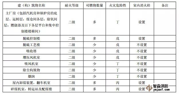 脫硫工藝樓,增壓風機室,吸收塔,吸風機室,屋內高壓配電裝置(無油),除塵構筑物,運煤棧橋,運煤隧道,油浸變壓器檢修間,油浸變壓器室,供、卸油泵房,油處理室,岸邊水泵房、中央水泵房,灰漿、灰渣泵房,生活消防水泵房,穩(wěn)定劑室、加藥設備室,進水、凈水構筑物,冷卻塔,化學水處理室,循環(huán)水處理室,啟動鍋爐房,供氫站,推煤機庫,消防車庫,貯氫罐,空氣壓縮機室(有潤滑油),熱工、電氣、金屬實驗室,天橋,排水、污水泵房,各分場維護間,污水處理構筑物,電纜隧道,材料庫棚,機車庫,警衛(wèi)傳達室。
