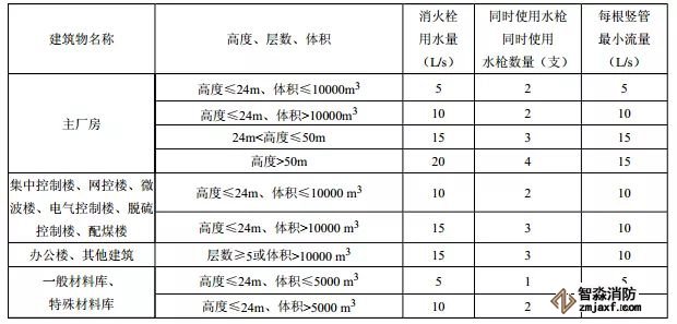 火力發(fā)電廠為工業(yè)建筑,為了便于操作,根據(jù)各建筑的內部情況和火災危險性,明確了設置室內消火栓的建筑物和場所。見表4。在電氣控制樓等帶電設備區(qū),應配置噴霧水槍,增強消防人員的安全性。