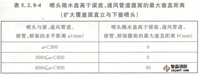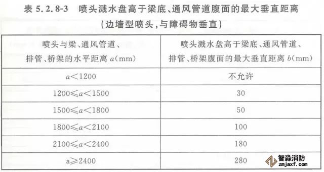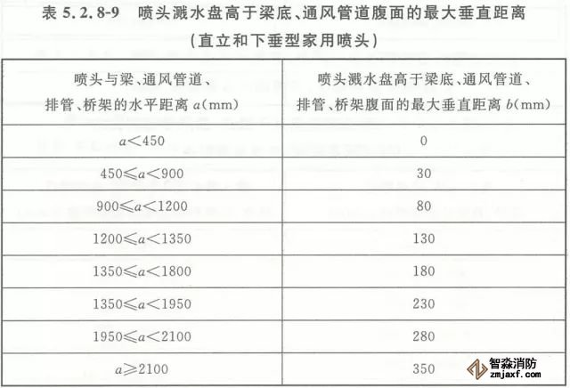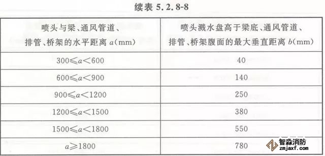 5.2.8 當噴頭濺水盤高于附近梁底或高于寬度小于1.2m的通風管道、排管、橋架腹面時,噴頭濺水盤高于梁底、通風管道、排管、橋架腹面的最大垂直距離應符合表5.2.8-1~表5.2.8-9的規定(見圖5.2.8)。