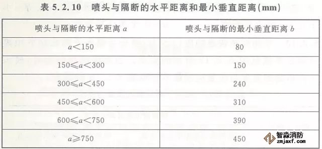 5.2.10 當噴頭安裝在不到頂的隔斷附近時,噴頭與隔斷的水平距離和最小垂直距離應符合表5.2.10的規定(見圖5.2.10)。