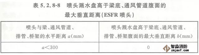 5.2.11 下垂式早期抑制快速響應(ESFR)噴頭濺水盤與頂板的距離應為150mm~360mm。直立式早期抑制快速響應(ESFR)噴頭濺水盤與頂板的距離應為100mm~150mm。