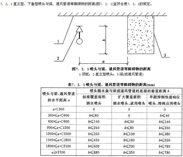 直立型灑水噴頭濺水盤與頂板的距離應為75mm~150mm,并應符合下列規定:1 當在梁或其他障礙物底面下方的平面上布置灑水噴頭時,濺水盤與頂板的距離不應大于300mm,同時濺水盤與梁等障礙物底面的垂直距離應為25mm~100mm。2 當在梁間布置灑水噴頭時,灑水噴頭與梁的距離應符合本規范第7.2.1條的規定。確有困難時,濺水盤與頂板的距離不應大于550mm。梁間布置的灑水噴頭,濺水盤與頂板距離達到550mm仍不能符合本規范第7.2.1條的規定時,應在梁底面的下方增設灑水噴頭。3 密肋梁板下方的灑水噴頭,濺水盤與密肋梁板底面的垂直距離應為25mm~100mm。