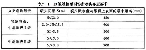 裝設網格、柵板類通透性吊頂的場所,當通透面積占吊頂總面積的比例大于70%時,噴頭應設置在吊頂上方,并應符合下列規定:1 通透性吊頂開口部位的凈寬度不應小于10mm,且開口部位的厚度不應大于開口的最小寬度;2 噴頭間距及濺水盤與吊頂上表面的距離應符合表7.1.13的規定。