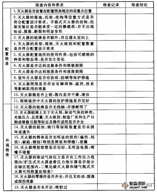 根據(jù)GB50444要求,滅火器的配置、外觀等至少每月檢查一次;對(duì)于候車(機(jī)、船)室、歌舞娛樂放映游藝等人員密集的公共場(chǎng)所,以及堆場(chǎng)、罐區(qū)、石油化工裝置區(qū)、加油站、鍋爐房、地下室等場(chǎng)所,至少每半月檢查一次,基本檢查內(nèi)容及要求如下: